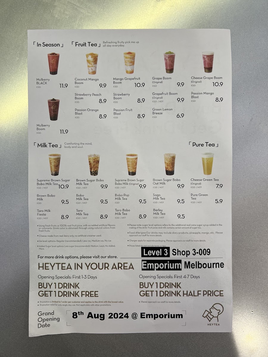 From a reviewer’s perspective, the menu at Tea (Emporium) feels both vibrant and thoughtfully curated, with a clear emphasis on creative matcha and specialty tea blends. Standout items like the Matcha Bobo Coconut and the staff-favorite Cloud Coconut Blue immediately set a refreshing tone, while richer options such as the Triple Supreme Matcha Latte and Supreme Brown Sugar Bobo Milk Tea cater to those seeking indulgence. The matcha range, including Supreme Matcha Latte, Cloud Matcha Latte, and Triple Supreme Matcha Latte, highlights a strong dedication to depth of flavor, complemented by wellness-focused choices like Kale Boost Tea. Classic offerings such as Jasmine Tea and Black Tea Latte balance the menu, while fruit-forward drinks like Mulberry Strawberry Boom and Coconut Mango Boom add a playful twist. Seasonal warm options, including Hot Matcha Cloud Jasmine Latte and Hot Triple Supreme Matcha Latte, round out the selection nicely. With customizable extras like Matcha Jelly, Brown Sugar Bobo, and Cheese Cloud, the menu ultimately delivers a versatile and satisfying tea experience, even though pricing details are not specified.